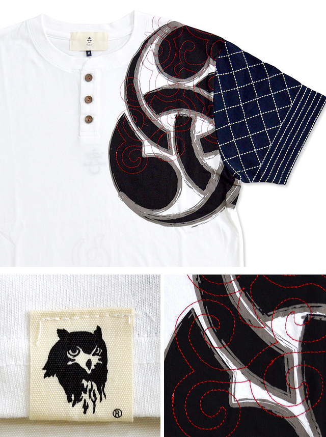着た人、それを見た人が笑顔になれる、他にはないデザインを提供し続けている「喜人」さんから、 両袖に刺子風ステッチが施されたリメイク風の半袖Tシャツが登場しました! フロント左身頃、バック裾には結び巴の紋が入っており、まるで手描きのような風合いが絶妙です。 そこに重なるような形で、レッドのステッチで唐草が入っており、立体感のあるデザインに。 襟元はヘンリーネック仕様。 ボディーには、綿100%の非常に柔らかく薄手なTシャツ生地を採用。 | ||||||||||||||||||||||||||||||