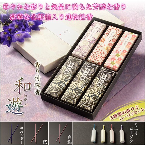 化粧箱入り進物用線香【香り付き線香 和遊:3種類+五色ミニ寸ローソク3箱セット】贈答用線香 お盆・お彼岸