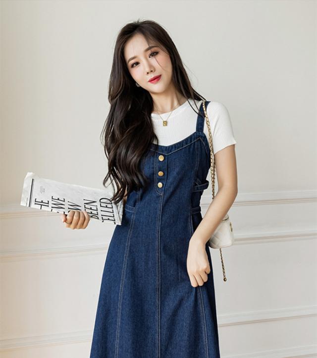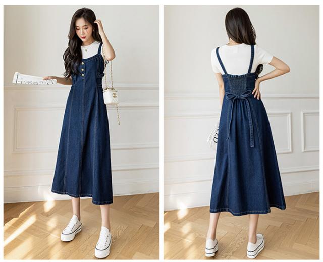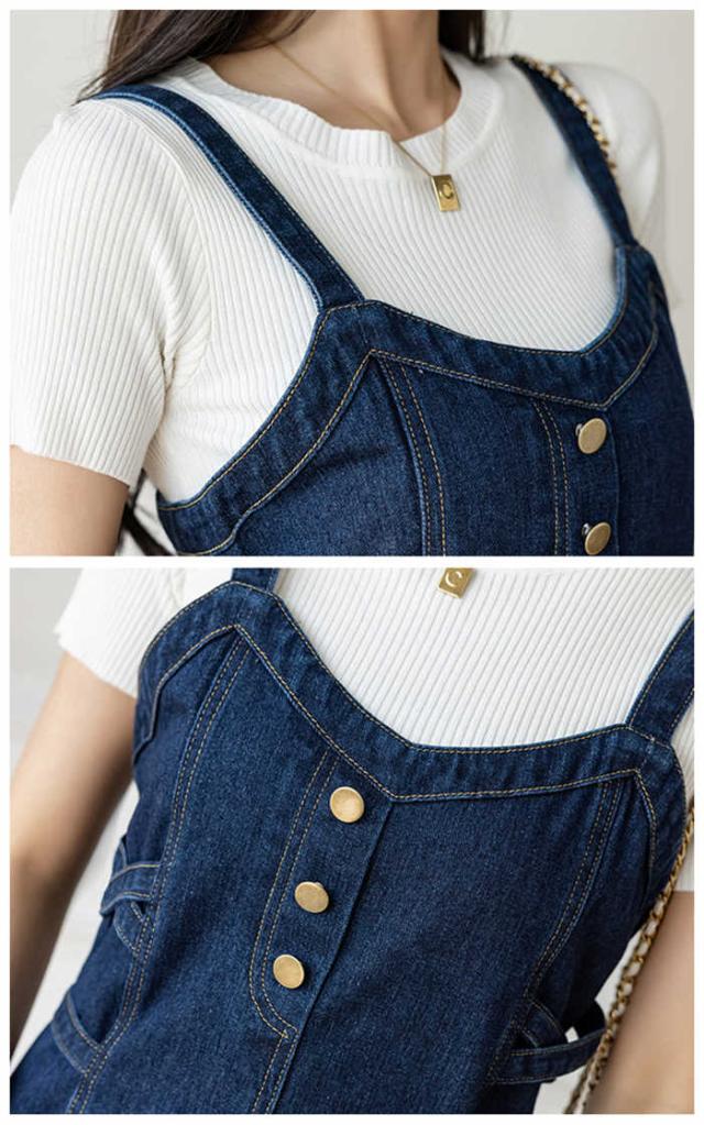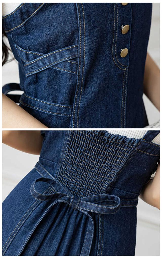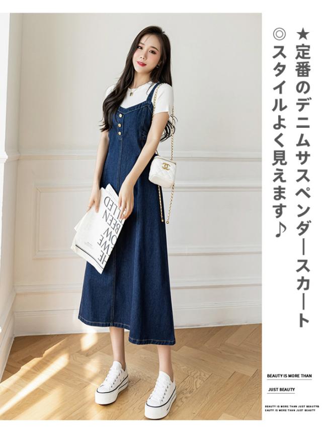 ジャンバースカート Vネック デニム ワンピース レディース ジャンスカ オーバーオール サロペット オールインワン デニムスカート 膝丈 ミモレ丈 ロング丈