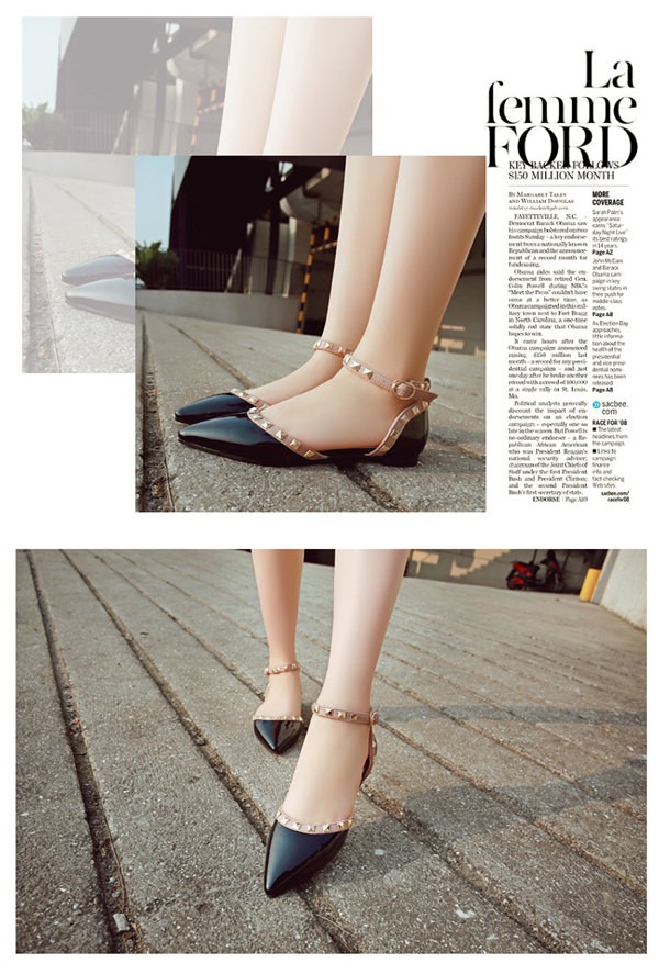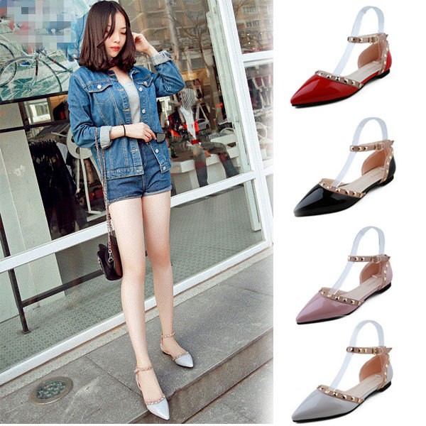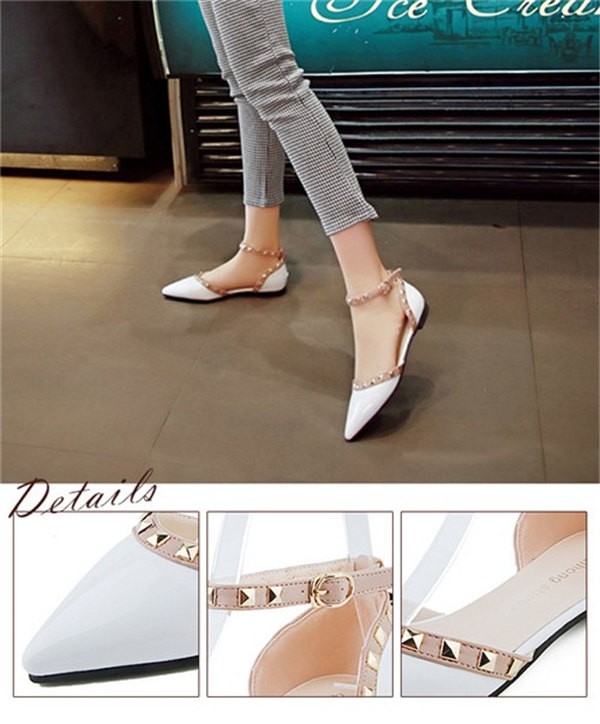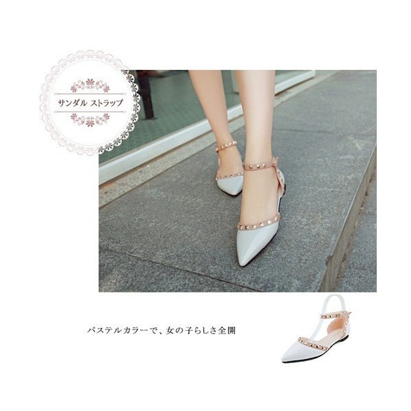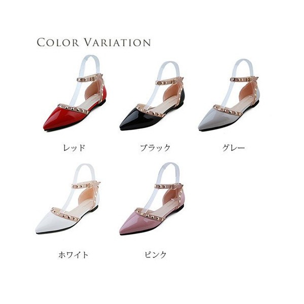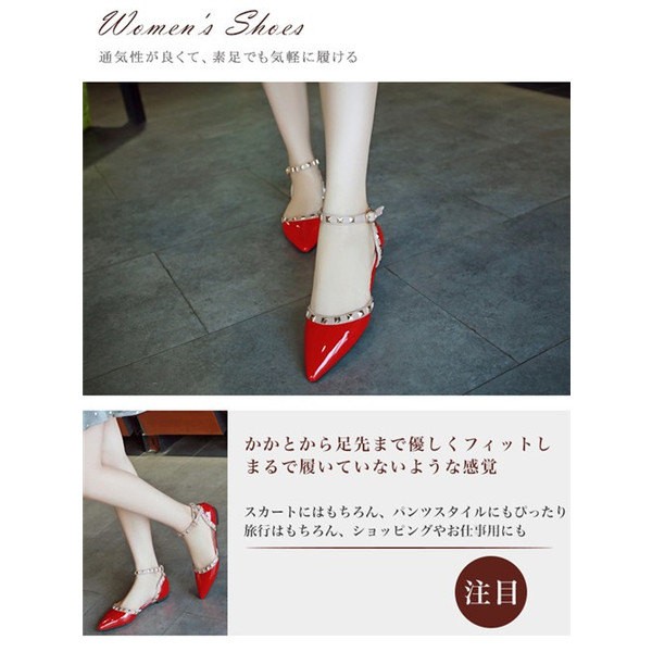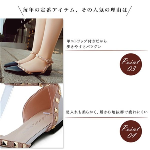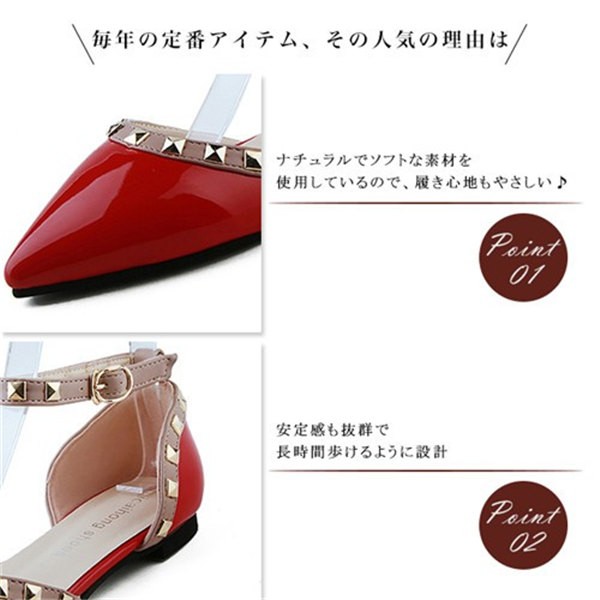 パンプス ペタンコ レディース ぺたんこ ポインテッドトゥ スタッズ付 アンクルストラップ フラットシューズ キャバ嬢 パーティー 結婚式