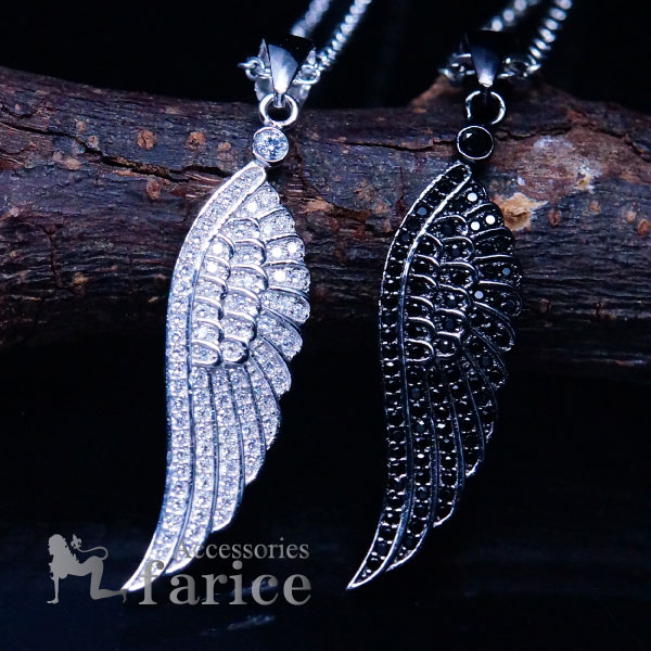 エンジェルフェザー(天使の羽) クリア or ブラックストーン・全面パヴェ装飾 シルバー925 ネックレス【シルバー or ブラック】