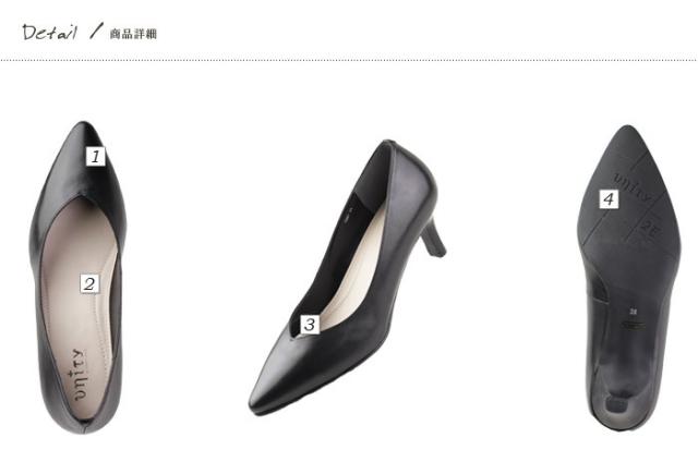 スッキリとしたポインテッドトゥのつま先に、Vラインカットの履き口でほんのりモード。スタイリッシュな中にも女性らしさを感じさせる、[ ユニティ ( unity ) 」 のパンプス。ごく普通の黒パンプスに見えて、他とは違うデザインで、できる女のカッコ良さを際立たせます。スーツスタイル、お仕事スタイル等にはもちろんのこと、普段使いでもお使いいただけます。程よいヒールの高さできちんと感も十分。インソールにもクッションが入っているので、足の疲れも軽減してくれます。