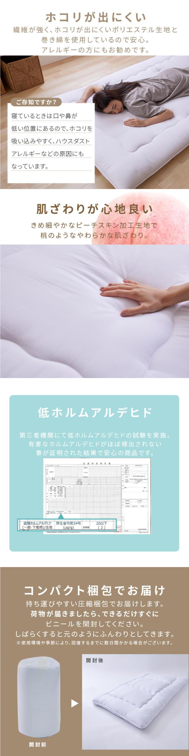 - 期待したほどフワフワではありませんでした。 厚みは10cmですが、1枚だけだとベッドの木に当たっているような感じです。 なので下に固い布団を敷いてから使っています。 2枚重ねにした為、毎日布団乾燥機がかかせません。