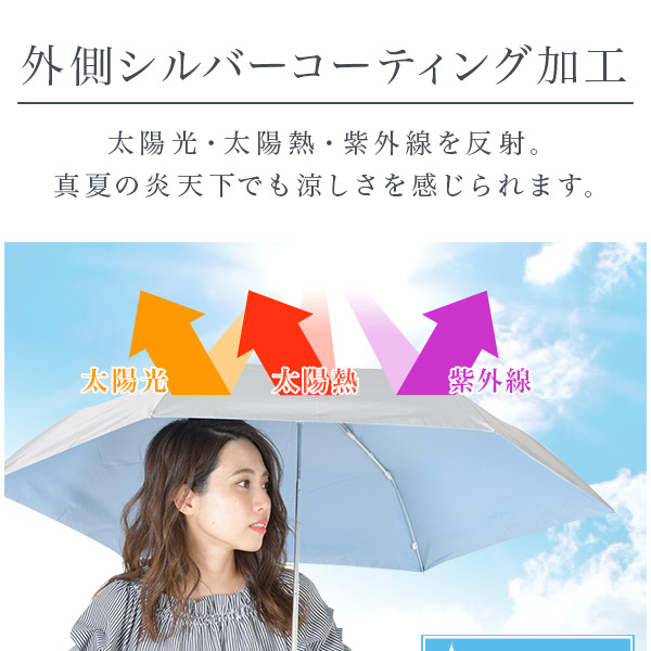 ■外側シルバーコーティングで太陽熱・太陽光・紫外線を反射。UVカット率99%以上/遮光率99%以上、重さ約250gの軽量で大きい折りたたみ日傘が登場