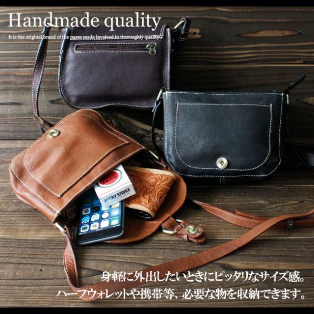 キメが細かくとても柔らかくて肌触りのいいカーフスキン(子牛の革)を使用し、革職人がハンドメイドで製作しています。ちょっとしたものを持ち運ぶのに便利なショルダータイプのバッグとなっています。カジュアルで男女問わず合わせやすい肩掛けポーチです。