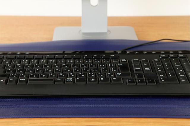 先ほどモニターの背面に・・・とご紹介させていただきました、カバー未使用時の置き場所ですが、上の写真のようにキーボードの下に敷いていただいても邪魔になりません。