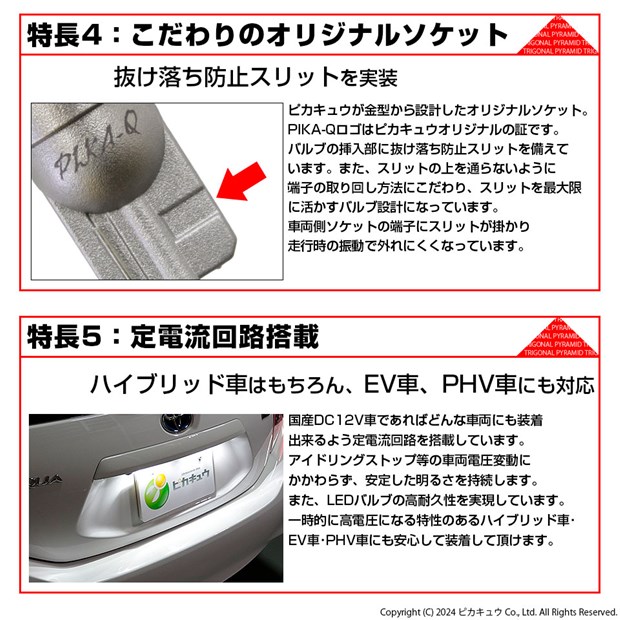 ピカキュウが金型から設計したオリジナルソケット。PIKA-Qロゴはピカキュウオリジナルの証です。バルブの挿入部に抜け落ち防止スリットを備えています。また、スリットの上を通らないように端子の取り回し方法にこだわり、スリットを最大限に活かすバルブ設計になっています。車両側ソケットの端子にスリットが掛かり走行時の振動で外れにくくなっています。