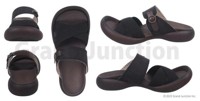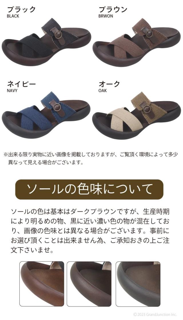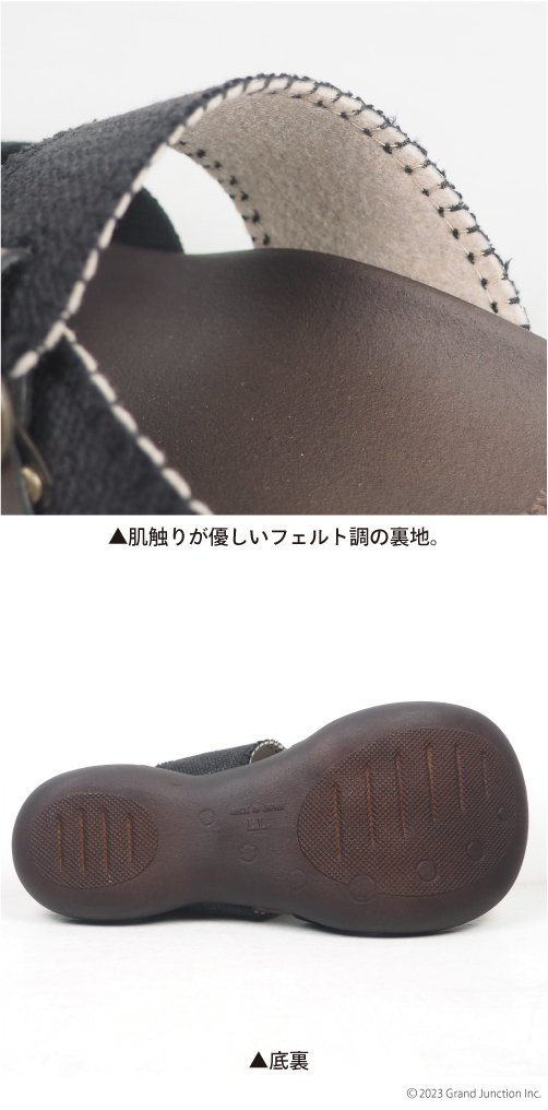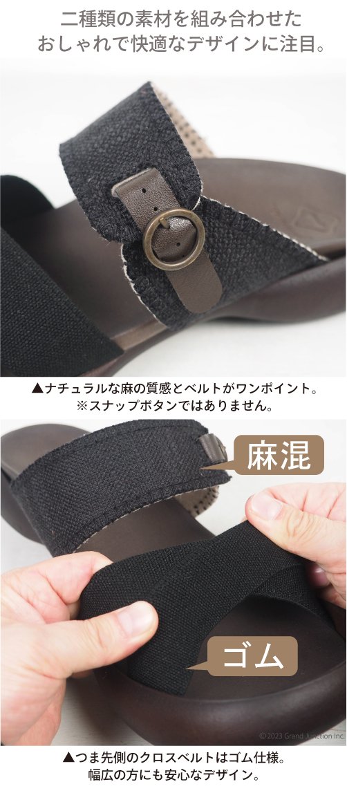 麻に似たナチュラルな質感の甲ベルトと、クロスに配置したゴムベルト。 異素材組み合わせのコンビネーションデザインが◎! 特にクロスベルトは一見ゴムに見えないので、履いて快適!見た目はスタイリッシュ!に仕上げています。