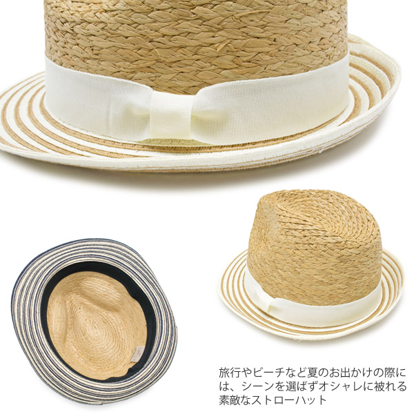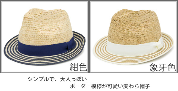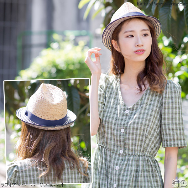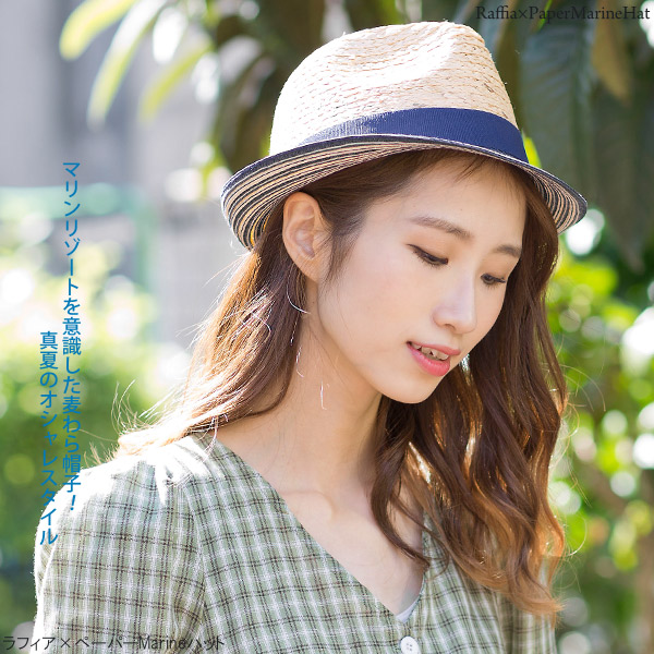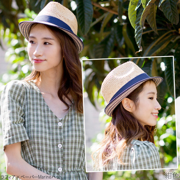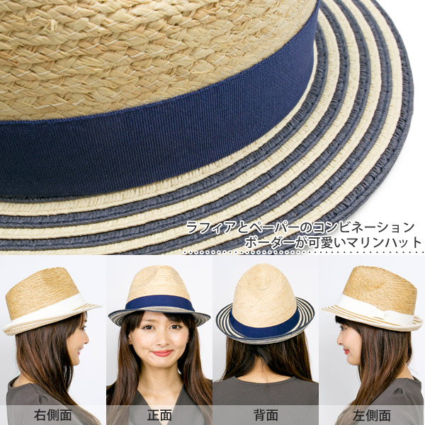 麦わら帽子 レディース ハット 春夏 ラフィア ストローハット マリン ボーダー サイズ調節 HAT / ラフィア×ペーパーMarineハット