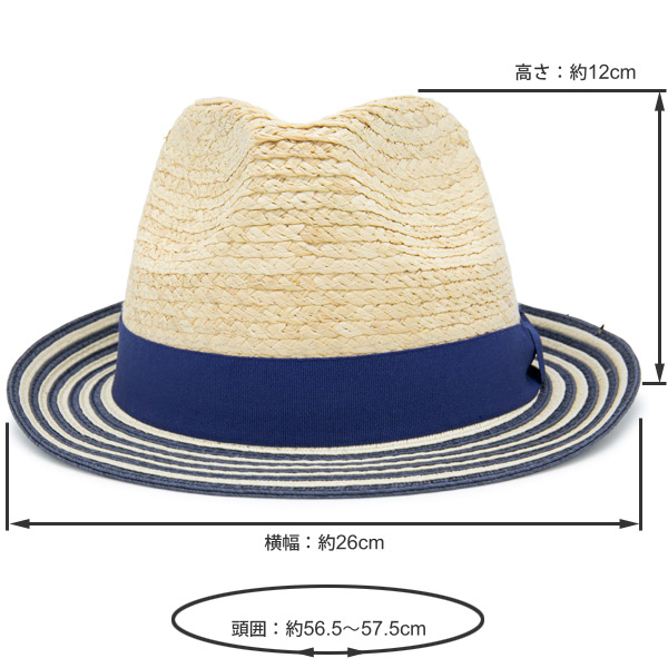サイズ表記57.5cm(頭囲:約56.5〜57.5cm[紐でサイズ調整可能]、高さ:約12cm、横幅:約26cm[つばも含む]、つばの長さ:約4.5cm)