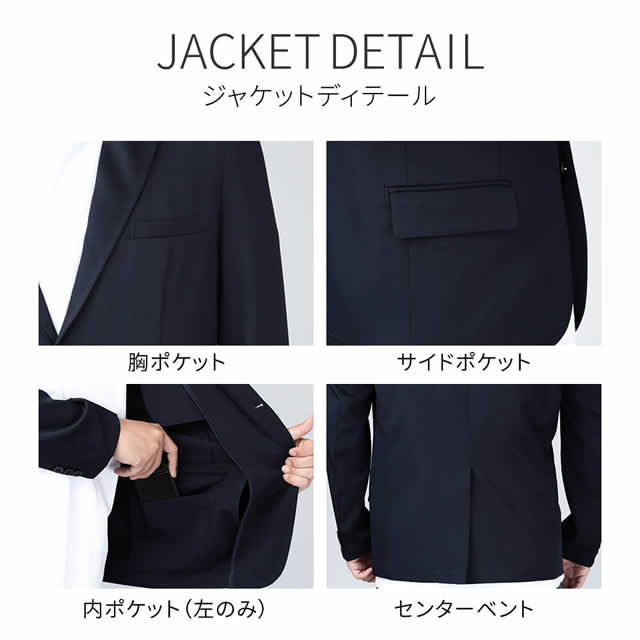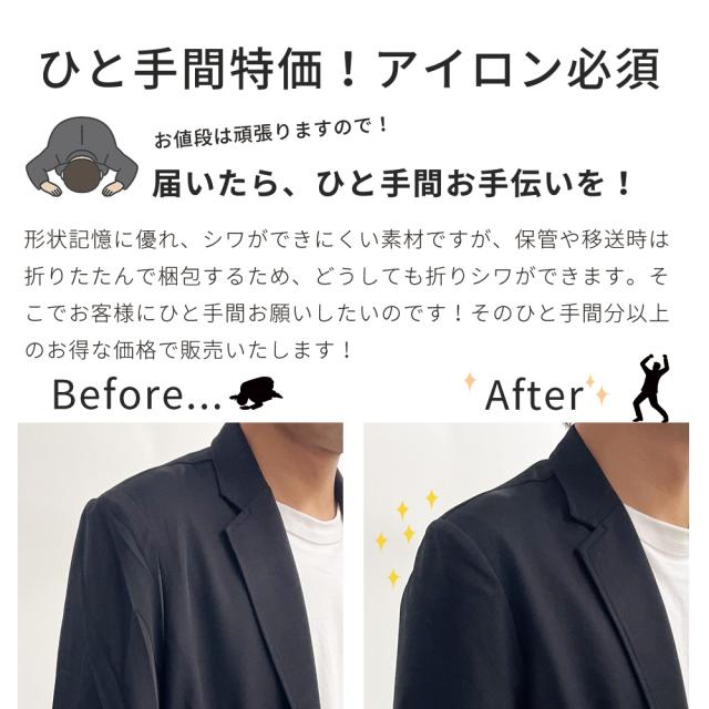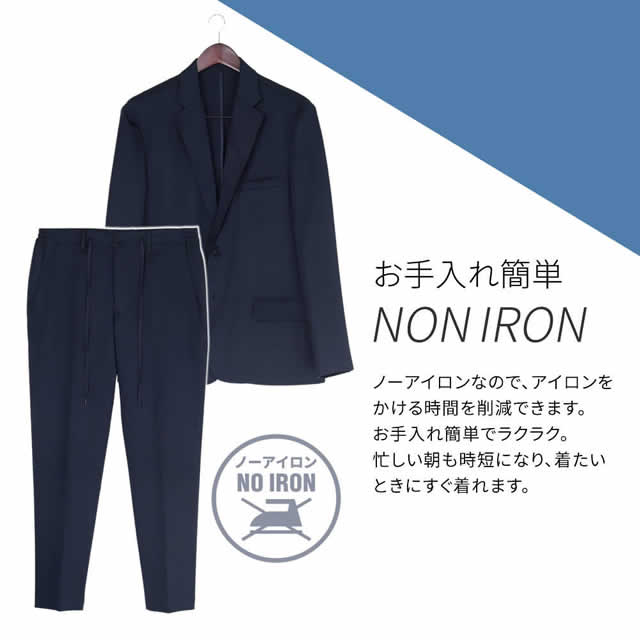 このセットアップはジャケットもパンツも程よいストレッチ感で、1日中ストレスフリー!快適に過ごせます。また、素材はシワになりにくく洗濯機で洗えるので、(※お手入れ方法をご覧ください)スーツよりも断然お手入れ簡単です。通常のスーツと違い軽量仕上げなので、是非、この軽さも実感してください!丁寧な縫製で安さを感じさせない作り、一度着るとやみつきになります。
