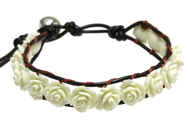 本革と珊瑚を使用したブレスレットです。薔薇は本物のように細部まで表現されており、少し個性的なお洒落のワンポイントとしてお使いいただけます。