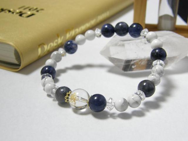 | 素 材&サイズ:内径/約16cm 金彫り水晶(弁財天)/約10mm 、ソーダライト/約8mm、ホワイトハウライト/約6mm、ボタンカット水晶/約3×6mm |
