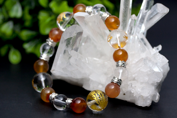 | 素 材&サイズ:水晶彫刻ビーズ(金彫り)14mm 4石、カーネリアン丸玉10mm 8石、水晶丸玉10mm 4石、メタルパーツ(銀色)7mm 8個 |
