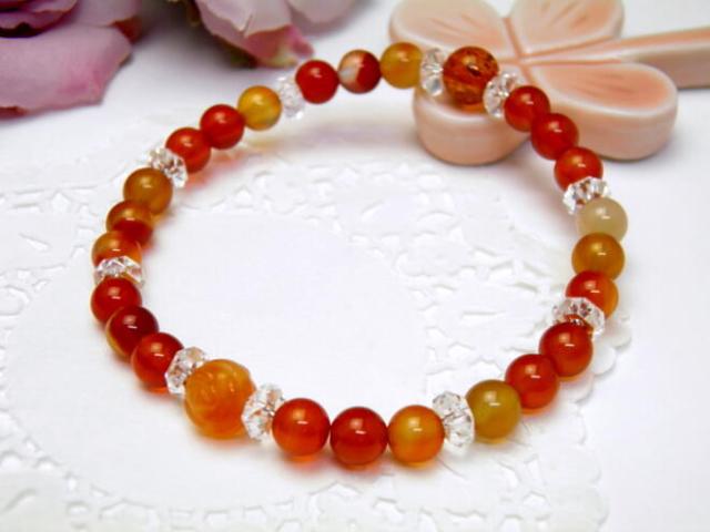 サイズ:内径/17cm、カーネリアン:薔薇8mm、合成琥珀:8mm、カーネリアン:6mm、水晶ボタンカット:3×6mm