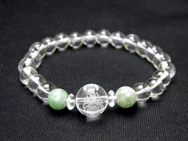 水晶の観音様が入ったありがたいブレスレットです。パワーストーンとして一番人気の石です。オールマイティーなパワーがあると言われますが、特に生命と力の宿る石、集中力とエネルギーを高め繁栄に導くと言われています。