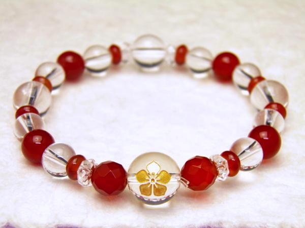 パワーストーン:素材・サイズ:【サイズ】家紋/12mm・水晶/8mm・カーネリアン/8mm、ボタン/3×6mm・ブレスレット内径:約16cm