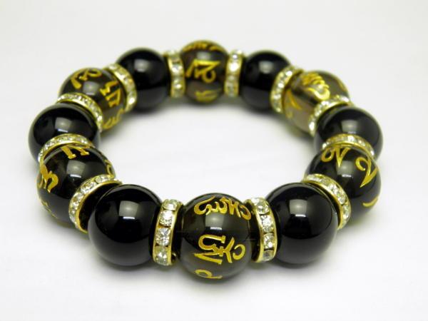 素 材&サイズ:金彫り六字真言スモーキークォーツ:16mm、オニキス:16mm、金ロンデル、内径:約15cm