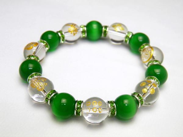 | 成 分&サイズ:金彫家紋水晶×キャッツアイ 【サイズ】家紋水晶12mm、キャッツアイ12mm、ロンデル使用 【内径】約17cm |