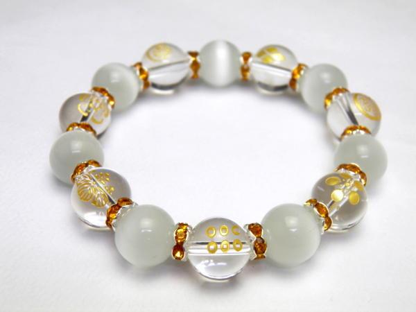 | 成 分&サイズ:金彫家紋水晶×キャッツアイ 【サイズ】家紋水晶12mm、キャッツアイ12mm、ロンデル使用 【内径】約17cm |