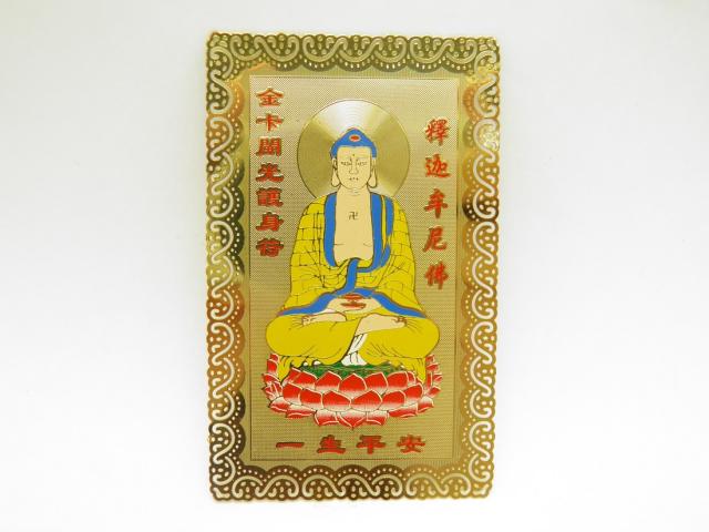 仏教の開祖。本来釈迦とは、ネパール地方にすんでいた部族の名でしたが、一般にはこの部族出身の聖者の個人名としてつかわれている。ただしくは「釈迦牟尼」といい、仏教徒は「釈迦牟尼世尊」または略して「釈尊」とよんでいる。ほかに「釈迦牟尼仏」「釈迦仏」「釈迦牟尼如来」という呼び方もある。釈迦の姓はゴータマ、名はシッダールタですが、呼び名の意味は悟った者の意で、「仏陀」という呼ばれ方もします。釈迦牟尼仏の名前はキリストと一緒で分かっていません。釈迦牟尼仏は悟りを開き幸福に過ごせ、幸運が期待できます。「開光護身符」は、闇が開け、光に包まれている護符という意味を表しています。この護符の裏には【元宝】が書かれています。