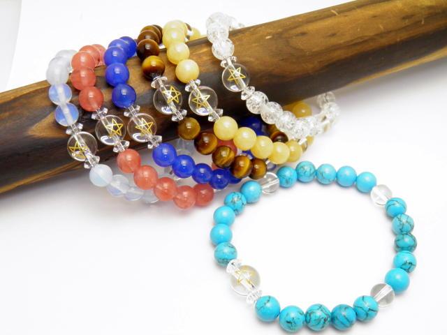 サイズ:五芒星:10mm、水晶、オニキス、ターコイズ、アラゴナイト、クラック水晶、ブルーメノウ、タイガーアイ、チェリークォーツ、オブシディアンオパール:8mm、内径:18cm
