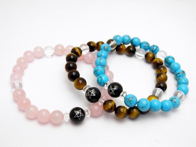 サイズ:五芒星(オニキス):10mm、水晶、ターコイズ、ローズクォーツ、タイガーアイ:8mm、内径:18cm