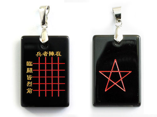 | 九字真言・五芒星両面 ペンダントトップ No.002(赤色)約30×20×5mm 天然石 パワーストーン 九字真言:護身の秘術として唱える呪文で「臨、兵、闘、者、皆、陣、烈、在、前(リン、ピョウ、トウ、シャ、カイ、ジン、レツ、ザイ、ゼン)」の九文字からなります。自分に襲い掛かろうとする邪悪なものに「臨む兵、闘う者、皆 陣烈(裂、列)れて(きて)前に在り」と宣言し、魔を避けるといわれています。 五芒星:五芒星は「木・火・土・金・水」を表していて、木を頂点にし、そこから時計回りで辿ると「木は土に剋(か)ち、土は水に剋(か)ち、水は火に剋(か)ち、火は金に剋(か)ち、金は木に剋(か)つ」という各元素が相克関係に配置されていることがわかります。これらは陰陽道の基本概念である陰陽五行説を表しています。 |