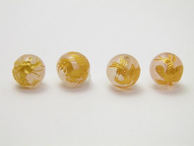 四神獣4点セット ローズクォーツ金彫り 彫刻ビーズ 10mm玉 青龍・朱雀・白虎・玄武 天然石 パワーストーン