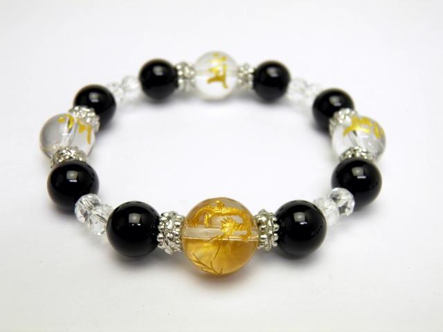 | 成 分&サイズ:天然水晶四面金彫り四神獣約14mm・水晶金彫り梵字約12mm、オニキス玉約10mm・パーツ・ゴム、内径:約16.5cm |