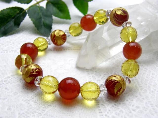 | 素 材&サイズ:レッドメノウ鳳凰金彫り:12mm、レッドメノウ:12mm、シトリンカット:10mm、水晶ボタン:6×3mm、内径:17cm |