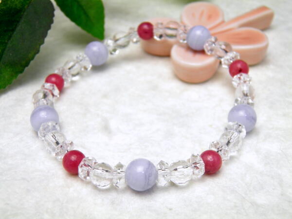 | 成 分:ブルーレース/8mm、ロードナイト/6mm・64面カット水晶/6mm、水晶ボタンカット/3×6mm、シリコンゴム サイズ:内径/16cm |