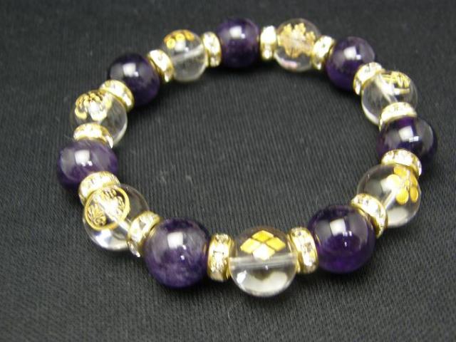 | 成 分&サイズ:金彫家紋水晶×アメジスト 【サイズ】家紋水晶12mm、アメジスト12mm、ゴールドロンデル使用 【内径】約17cm |