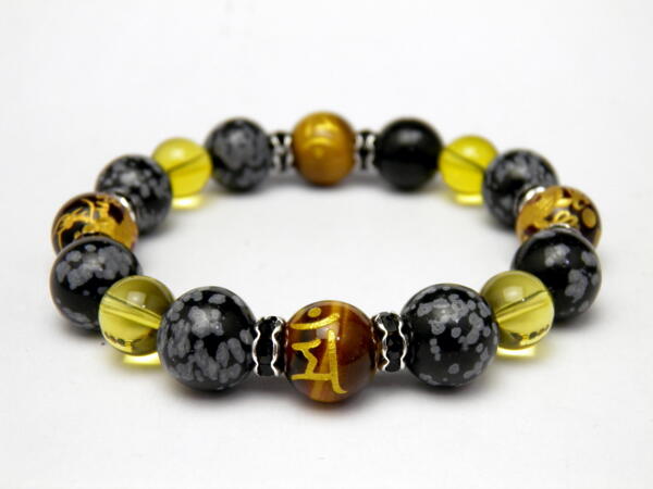 | 素 材&サイズ:レッドタイガーアイ金龍彫り×2&タイガーアイ金彫り梵字×2:12mm、スノーフレーク:12mm、シトリン:10mm、ロンデル:3mm、内径:17cm |