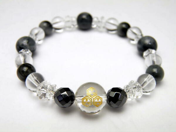| 成 分&サイズ:家紋入り水晶:約12mm、水晶:約8mm、ヘマタイト:8mm、水晶ボタンカット:3×6mm、4×8mm、イーグルアイ:約・8mm、10mm、内径:約17cm |
