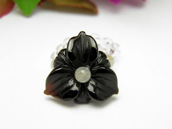 サイズ&素 材:オニキス、ハイビスカスサイズ:約19×19×5mm、丸ビーズ/水晶・ラブラドライト:約4mm(15玉)7号〜10号