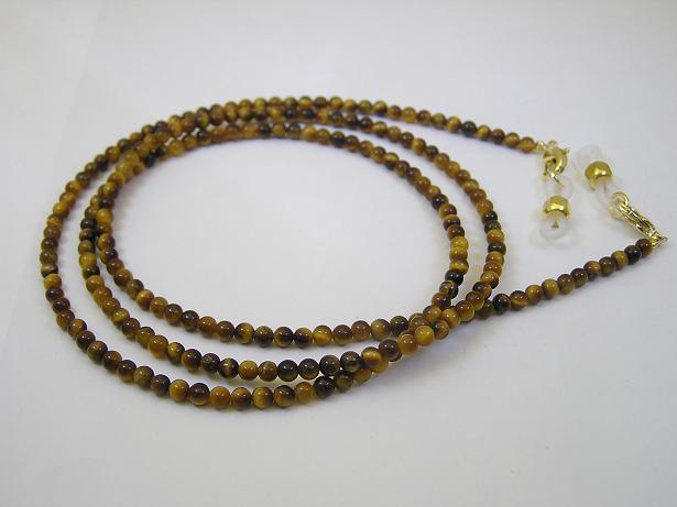 タイガーアイ使用のシックなメガネチェーンです。粒が小さいので重たい印象にならず、さりげないお洒落をアップさせます。タイガーアイの豊かな金色の輝きは、豊穣をあらわし、仕事運、金運を高める石としても知られています。また災いから身を守ってくれると言われ、お守り代わりに着けている方が多い石です。