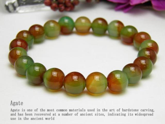 | クジャクメノウ 孔雀メノウ 10mm玉 ブレスレット 風水 パワーストーン 一つの玉を、緑と赤のハーフ&ハーフに染め分けた、クジャクのような色合いのメノウです。染め分けたと言っても、きっちり半分ずつになっている訳ではなく、アットランダムになっているのでラフな雰囲気が面白いです。緑は繁りの色、赤は実りの色で、繁栄の意味合いを秘めたおめでたいカラーリングです。 メノウ:バリエーションに富んだ色合いと模様を持つのが特徴です。世界各国で出土すること、またその美しさから、非常に古い世代よりカメオや勾玉など幅広く利用されてきました。さまざまな色と模様が融け合うことから「調和」「共生」を象徴し、層を成し内に空間を秘めることから母となる者を守護するなどとされます。幸運を育むと言われる万国共通のパワーストーンです。健康長寿、子宝・安産、家庭円満、幸運や冨貴などのお守りにどうぞ。 |