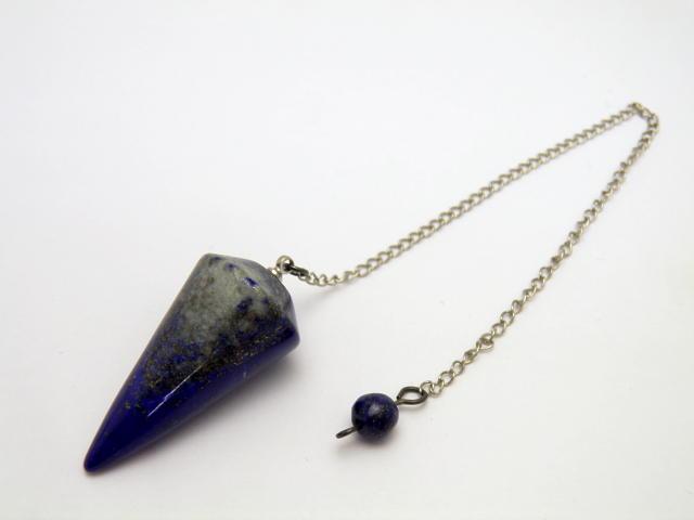 ラピスラズリ ペンデュラム。ペンデュラムは「ダウジング」に使う振り子です。人間の深い潜在意識にペンデュラムが呼応して回り、決断の手助けをしてくれると言われています。※チェーンの先が金具の場合と石付きの場合があり入荷時に寄って異なります。約17×35mm