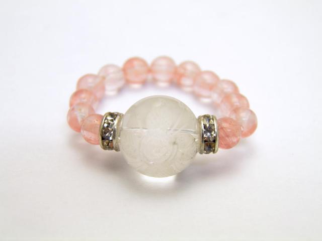 サイズ&素 材:花と蝶彫り水晶/10mm、チェリークォーツ/4mm、ロンデル/5×2mm、7号〜・11号〜(オペロンゴム使用なので伸びます)
