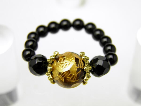 | サイズ&素 材:龍彫りタイガーアイ/10mm、オニキス64面カット/6mm、オニキス/4mm、ロジウムロンデル/8×3mm サイズ:約11号〜ゴム(使用なので伸びます) |