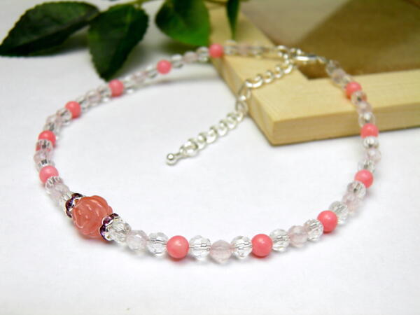 【アンクレット】 チェリークォーツ薔薇モチーフ&ピンク珊瑚・ローズクォーツ・水晶