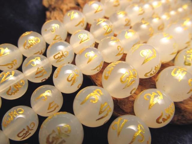 【六字真言・六字大明王陀羅尼】彫刻入り 金塗り ブラジル産 8mm珠 一連 ホワイトカルセドニー【白玉髄】AAA 天然石 パワーストーン