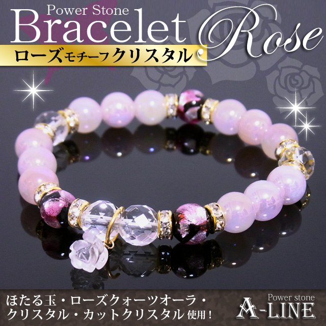 ローズモチーフ水晶&ほたる玉(ピンク)&ローズクォーツ・オーラ&64面カットクリスタル8mm・合金ロンデル・国産高級オペロンゴム