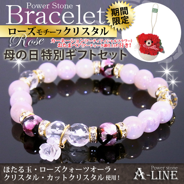 母の日ギフトSET ローズモチーフクリスタル&ほたる玉&ローズクォーツ・オーラ8mm おたまベアSET PW-3088b