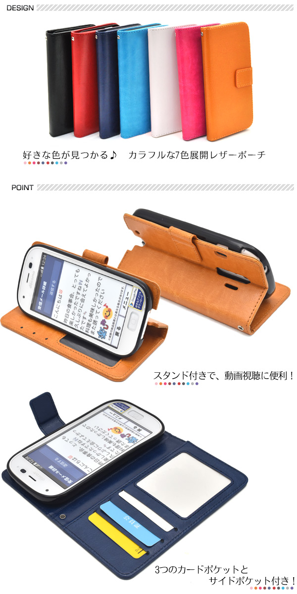 スマホケース 手帳型 らくらくスマートフォン 4 F-04J me F-03K カラーレザーケースポーチ シンプル ドコモ f-04j f-03k 横開き 合皮 無地 黒 赤 青 橙 白 水色 ピンク スマホカバー 保護ケース 人気
