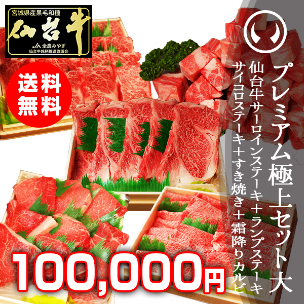プレミアム極上セット(大)最高級 A5仙台牛サーロイン5枚+ランプ10枚+サイコロ1000g+すき焼き1000g+カルビ1000g