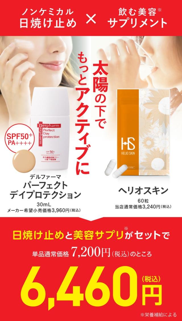 | 商品名 / 内容量 | デルファーマ パーフェクト デイプロテクション(SPF50+ PA++++) :30mL ヘリオスキン:26.4g(440mg×60粒)約1ヶ月分 ●配合成分につきましては、上記の商品名をタップしてご確認ください。 |