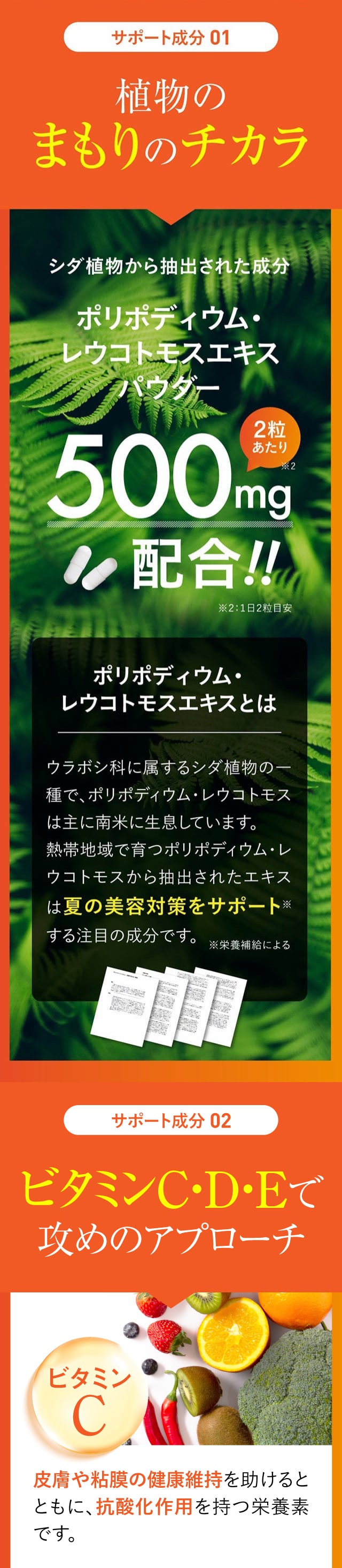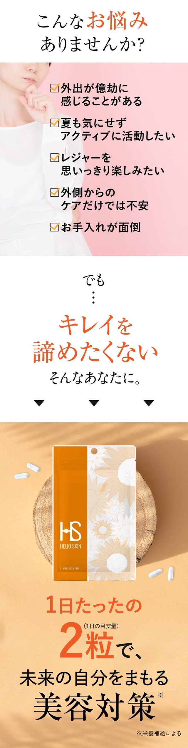 | 特徴 | パーフェクト デイプロテクション 紫外線吸収剤フリーの低刺激な日やけ止めで、ケミカルピーリング直後のデリケートな肌にもお使いいただけます。 肌を自然に明るくみせ、化粧のりを良くする化粧下地としてお使いいただけます。 うるおい成分(ヒアルロン酸、コラーゲン、スクワラン)、海藻エキスと3つの植物エキス配合 パッチテスト、アレルギーテスト済み(すべての方に刺激やアレルギーが起きないわけではありません) 紫外線吸収剤フリー、無色素、無香料、エタノールフリー、パラベン(防腐剤)フリー ヘリオスキン 日本人向けに医師と共同開発! 太陽の下でも元気に活動したいあなたをサポートする美容サプリメントです。 <サポート成分1:植物のまもりのチカラ> シダ植物から抽出された天然成分「ポリポディウム・レウコトモスエキスパウダー」を2粒あたり500mg配合しました(1日2粒目安)。ポリポディウム・レウコトモスとは、ウラボシ科に属するシダ植物の一種で、主に南米に生息しています。熱帯地域で育つポリポディウム・レウコトモスから抽出されたエキスは夏の美容対策をサポート(※)する注目の成分です。 <サポート成分2:ビタミンC・D・Eで攻めのアプローチ> 【ビタミンC】皮膚や粘膜の健康維持を助けるとともに、抗酸化作用を持つ栄養素です。 【ビタミンD】腸管でのカルシウムの吸収を促進し、骨の形成を助ける栄養素です。 【ビタミンE】抗酸化作用により、体内の脂質を酸化から守り、細胞の健康維持を助ける栄養素で す。 <安心・安全、信頼の証> 医師監修。GMP認定工場での国内製造。 <こんなお悩みに> 外出が億劫に感じることがある、夏も気にせずアクティブに活動したい、レジャーを思いっきり楽しみたい、外側からのケアだけでは不安、お手入れが面倒。 でもキレイを諦めたくない、そんなあなたに。 パウチタイプで持ち運びもラクラク。いつでもどこでも気になるときにサッと簡単チャージ。 いつまでもキレイでいたいあなたへ、未来の自分のための“飲む”美容対策(※)はじめませんか? (※)栄養補給による |