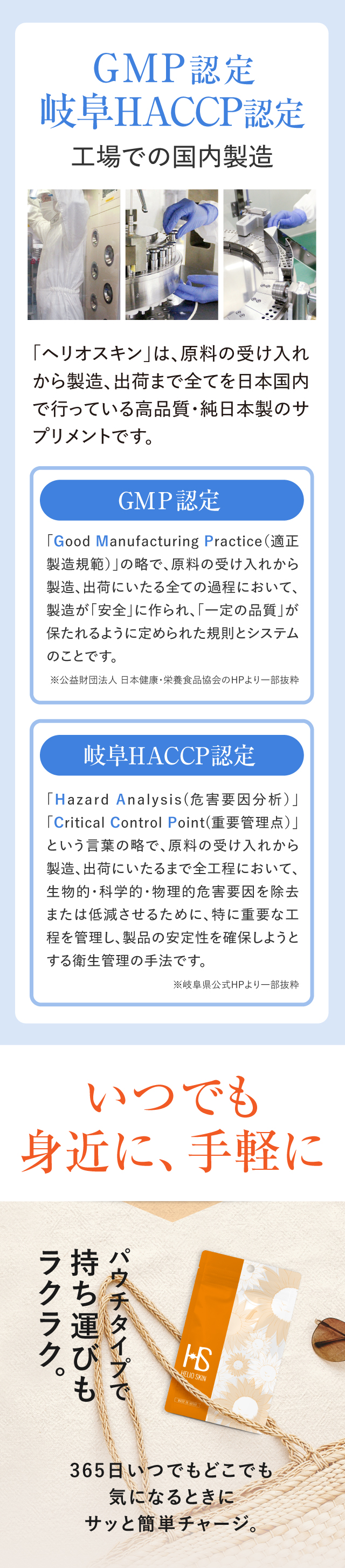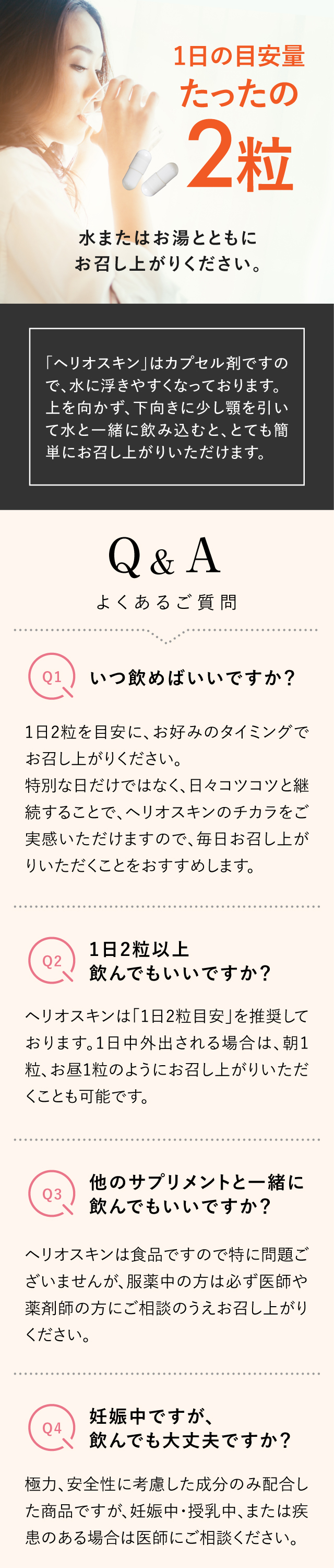 | お召し上がり方 | ヘリオスキン 1日2粒を目安に、水またはお湯とともにお召し上がりください。 |